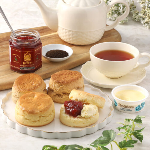中身 | スコーン(プレーン)2個入×1 スコーン(紅茶)2個入×1 ストロベリージャム200g×1 クロテッドクリーム40g×1 セイロンウバ60g袋入×1 ベノアオリジナルエコバック×1 |